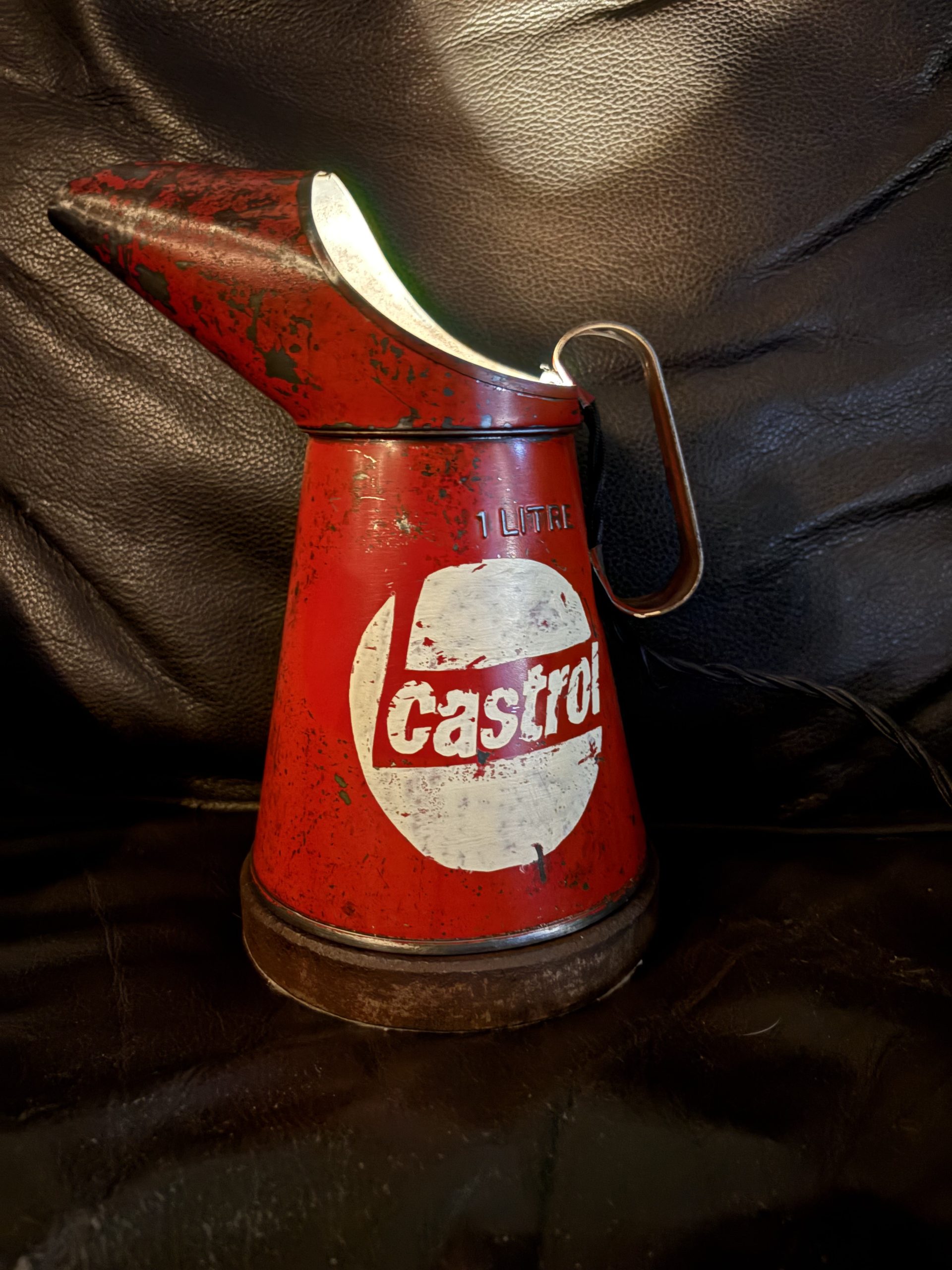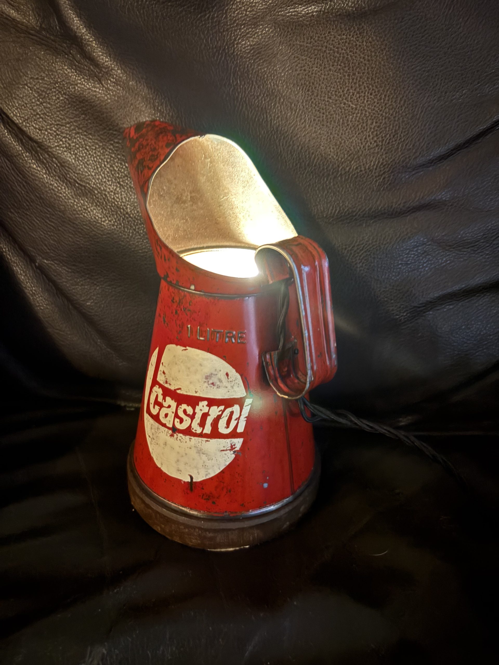 “Castrol Gear” is a 1950s oil pourer, stripped and re-painted with a pseudo-rusty look and gorgeous teal colour. Mounted on an old machine gearing cog, fitted with a bayonet cap lamp holder and low wattage LED lamp, with rust-brown braided flex and inline switch. Hand created and PAT tested for safety..