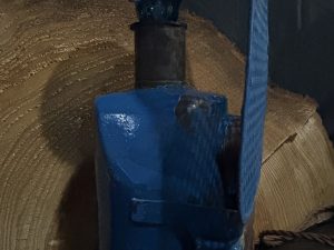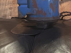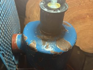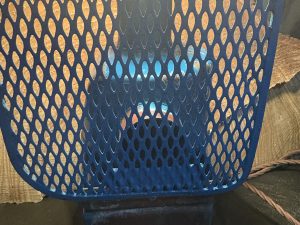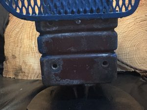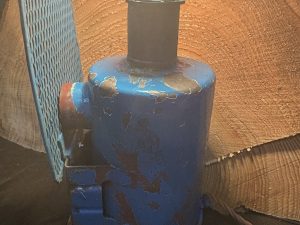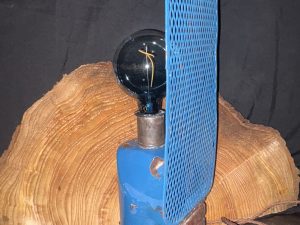 This is a rugged, but elegant lamp made on an agricultural/industrial theme. The base is a vintage agricultural draw hoe, and the main body is an air/oil cleaner from a vintage model tractor. The mesh is half of a radiator grill from the same machine. Loose flakes of paint have been cleaned off, wire wool helped remove old grease, oil and rust, and then covered with natural beeswax. A gorgeous, blue hued large bulb compliments this piece beautifully.