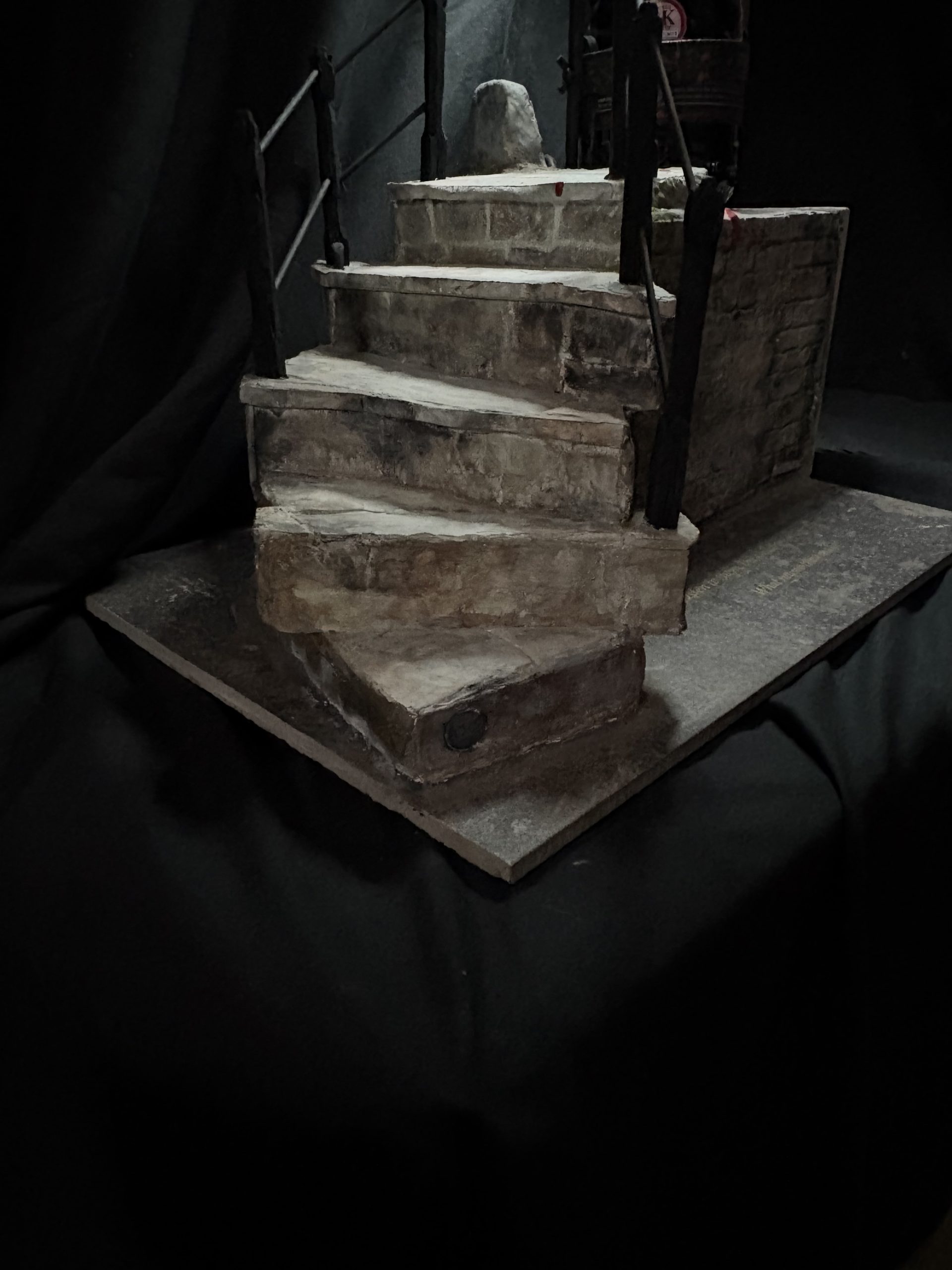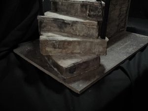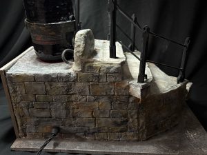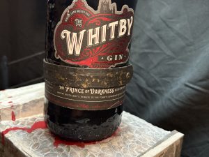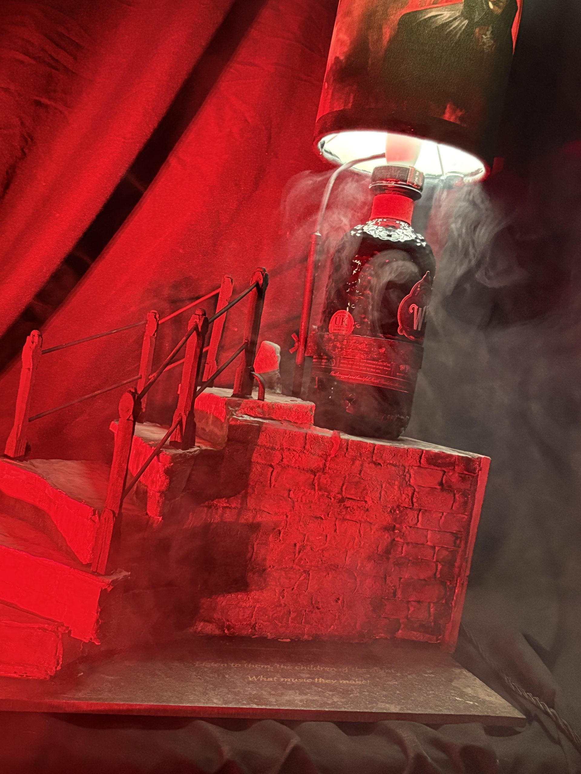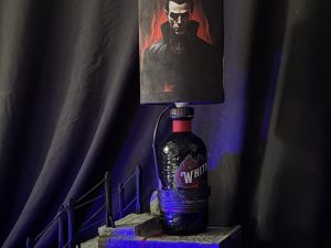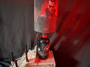 This lamp celebrates both the story and the famous town and steps, with a section of them, with hand rails, a milestone marker pointing to the ruined abbey, and a fabulous velvet shade with a striking image of the main character from the story. Also, in the spirit of spooky castles, hidden catches and doorways, the on/off switch is activated by tilting the lamp backwards. The body of the lamp is a beautiful Limited Edition gin bottle by the Whitby Distillery which also pays homage to the Bram stoker novel. It has a fabulous ammonite shell shaped base, which I have taken an imprint of for the bottle to sit in.