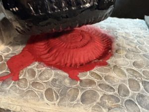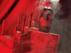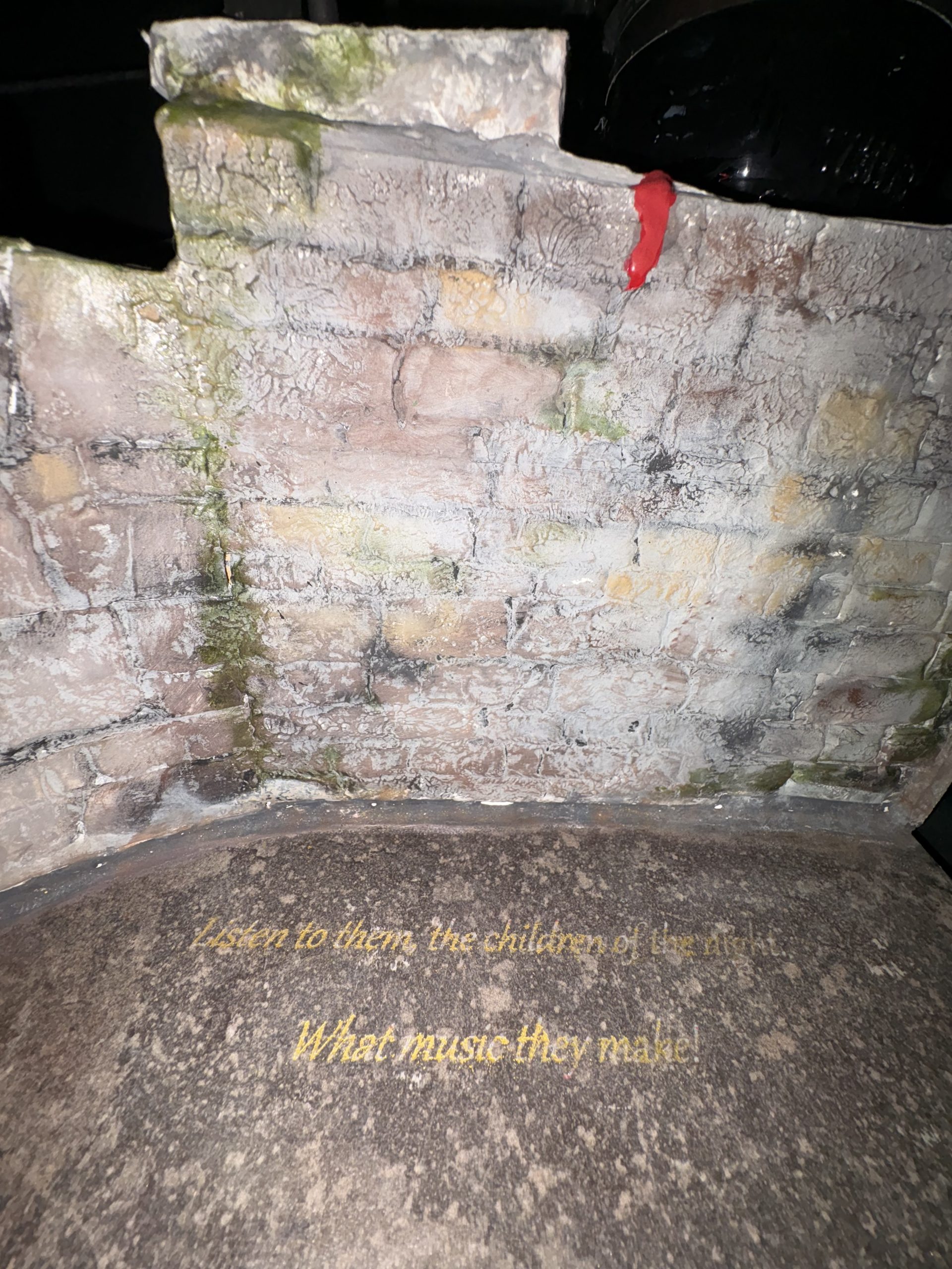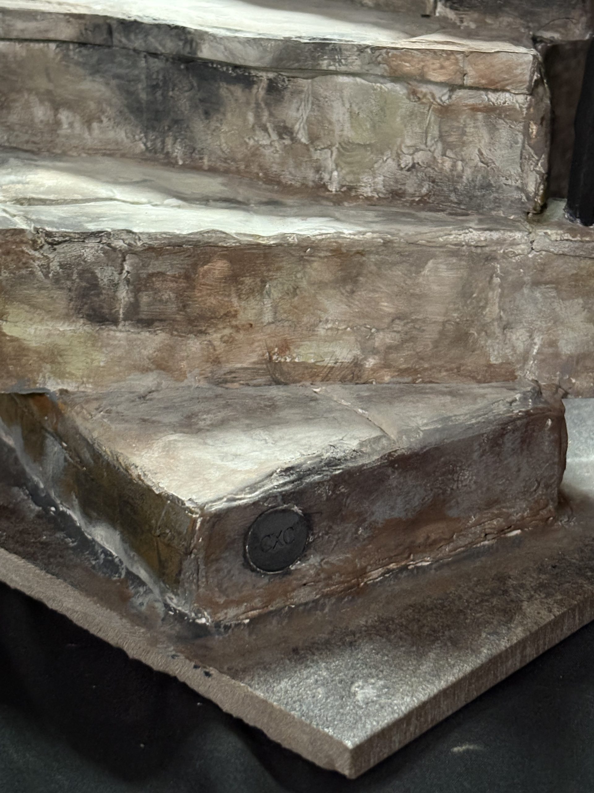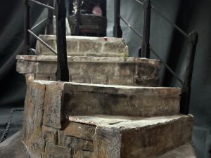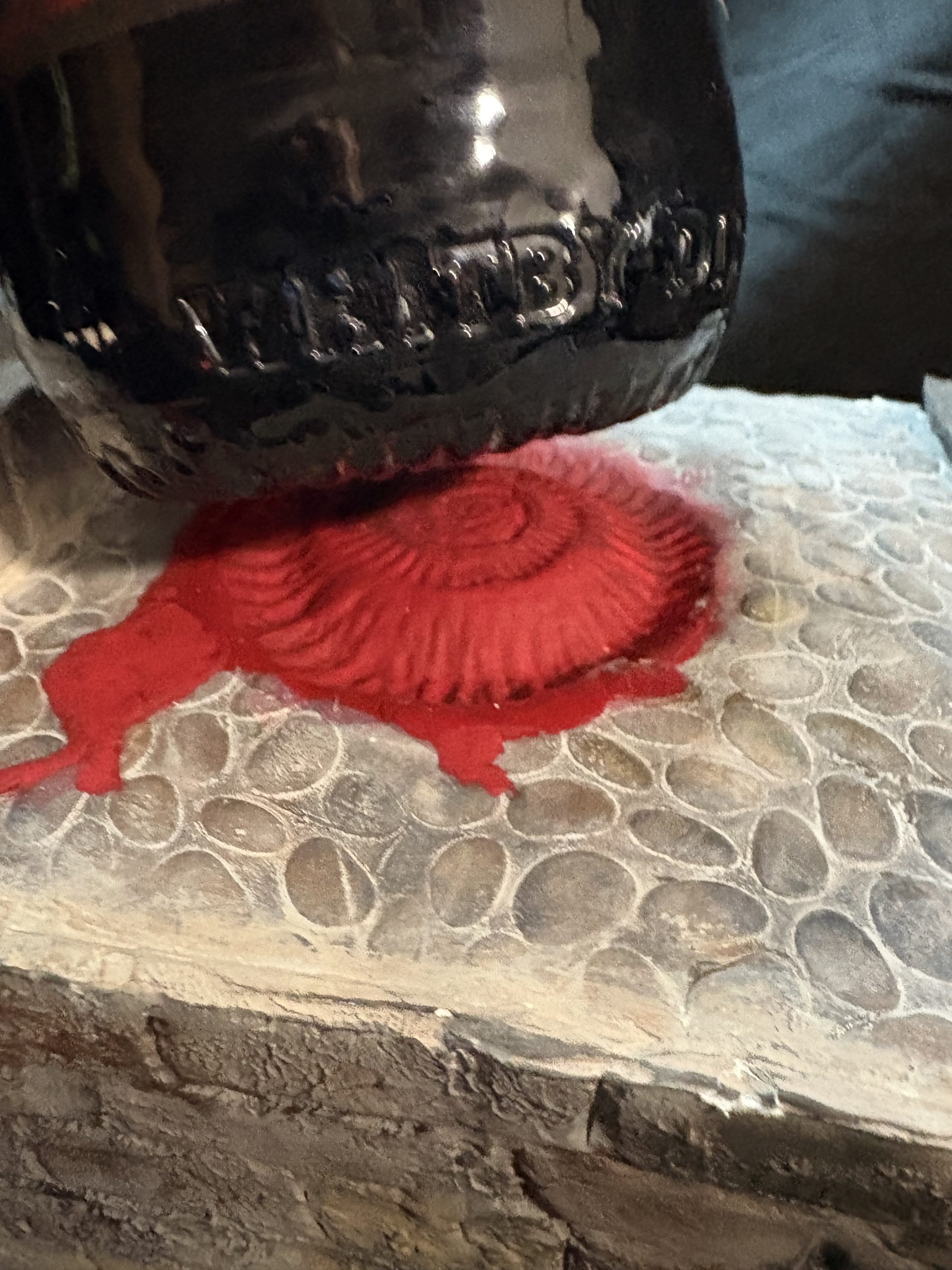 This lamp celebrates both the story and the famous town and steps, with a section of them, with hand rails, a milestone marker pointing to the ruined abbey, and a fabulous velvet shade with a striking image of the main character from the story. Also, in the spirit of spooky castles, hidden catches and doorways, the on/off switch is activated by tilting the lamp backwards. The body of the lamp is a beautiful Limited Edition gin bottle by the Whitby Distillery which also pays homage to the Bram stoker novel. It has a fabulous ammonite shell shaped base, which I have taken an imprint of for the bottle to sit in.
