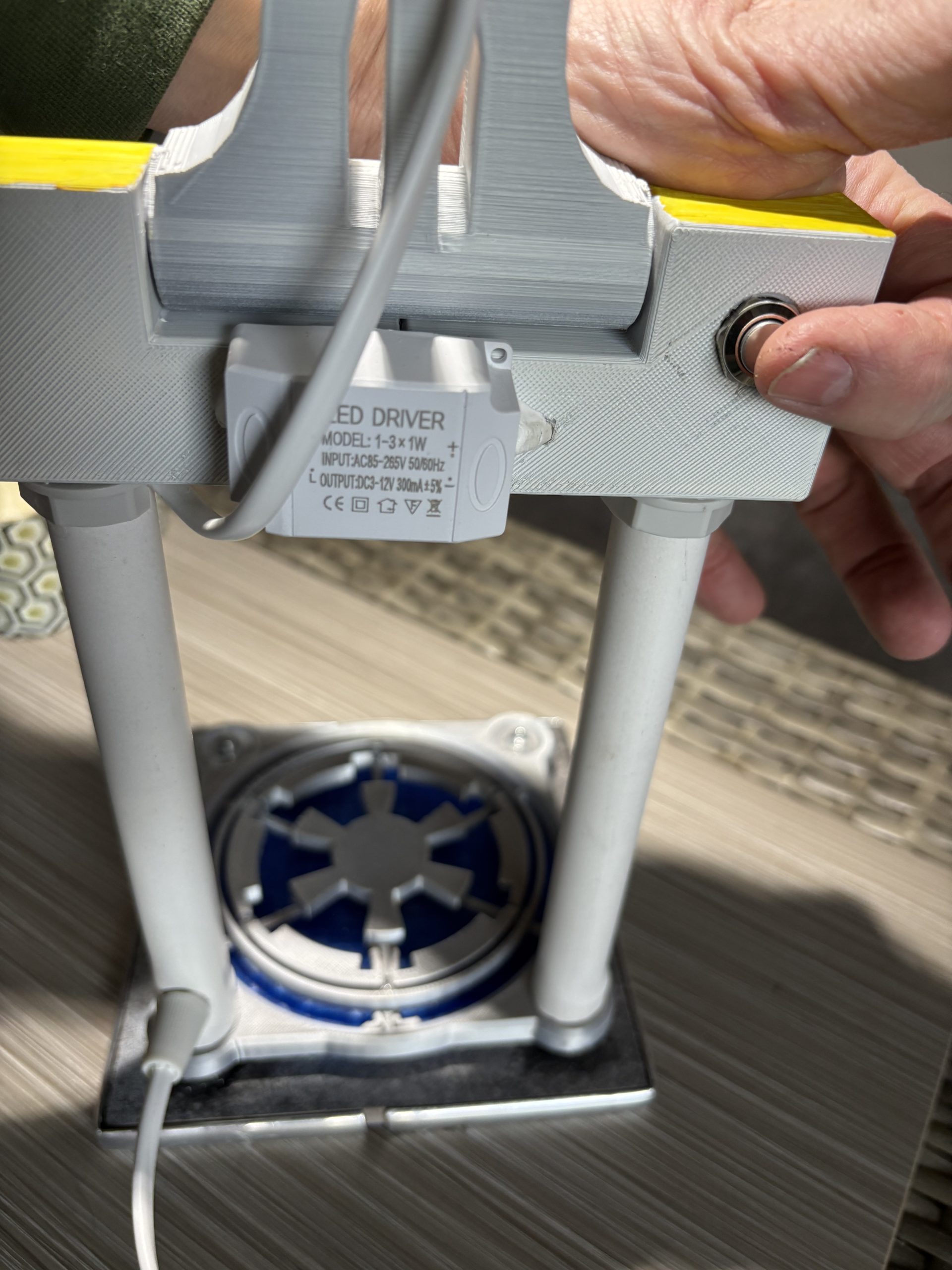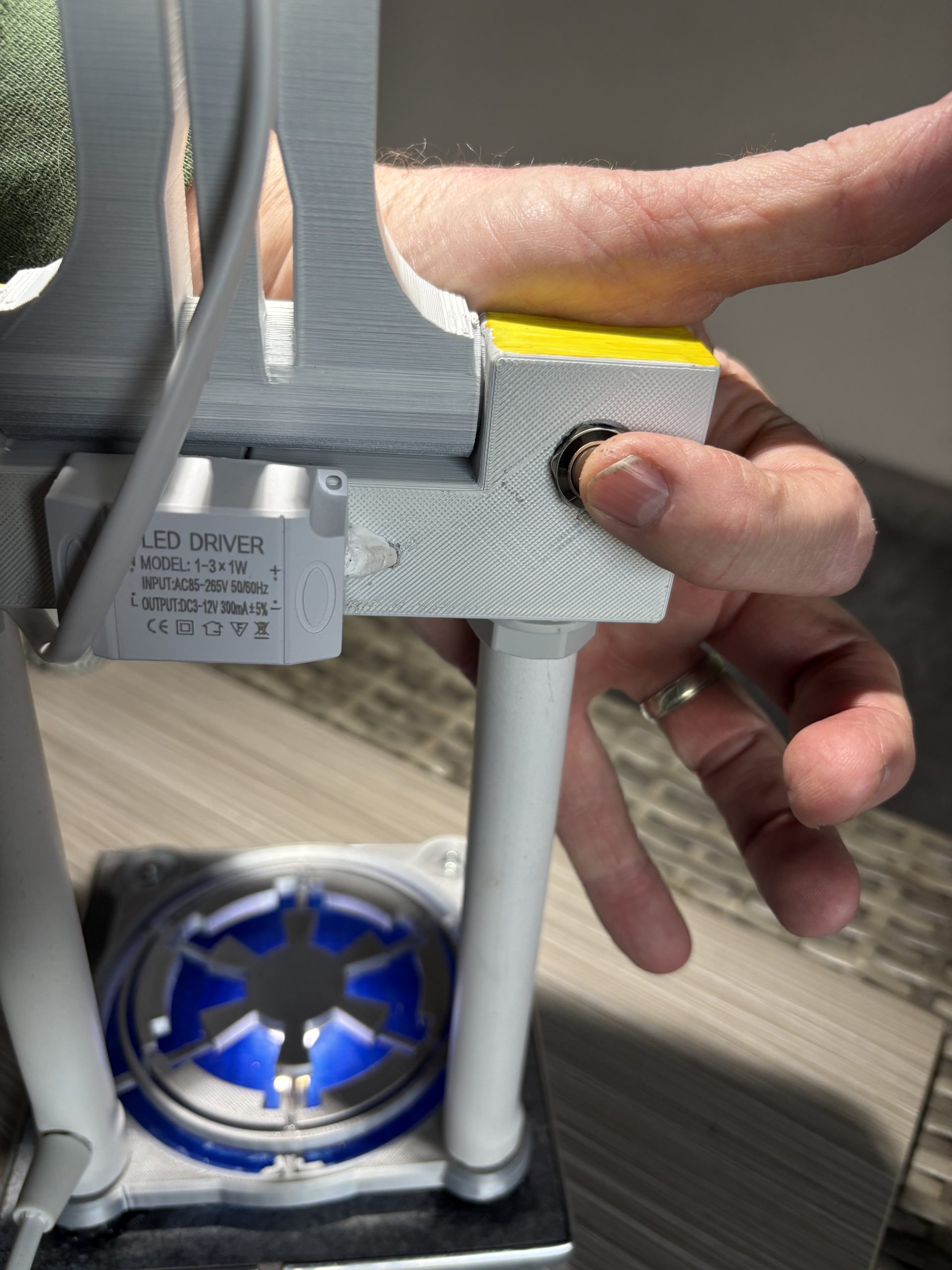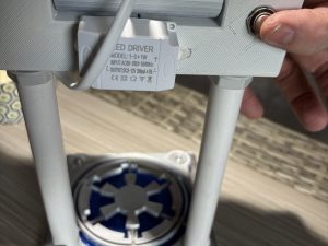 There is an under-lit base in the design of the Galactic Empire created by Senator Palpatine, with a striking blue basement, with the whole lamp being mounted on a ceramic base with a chrome styled trim.